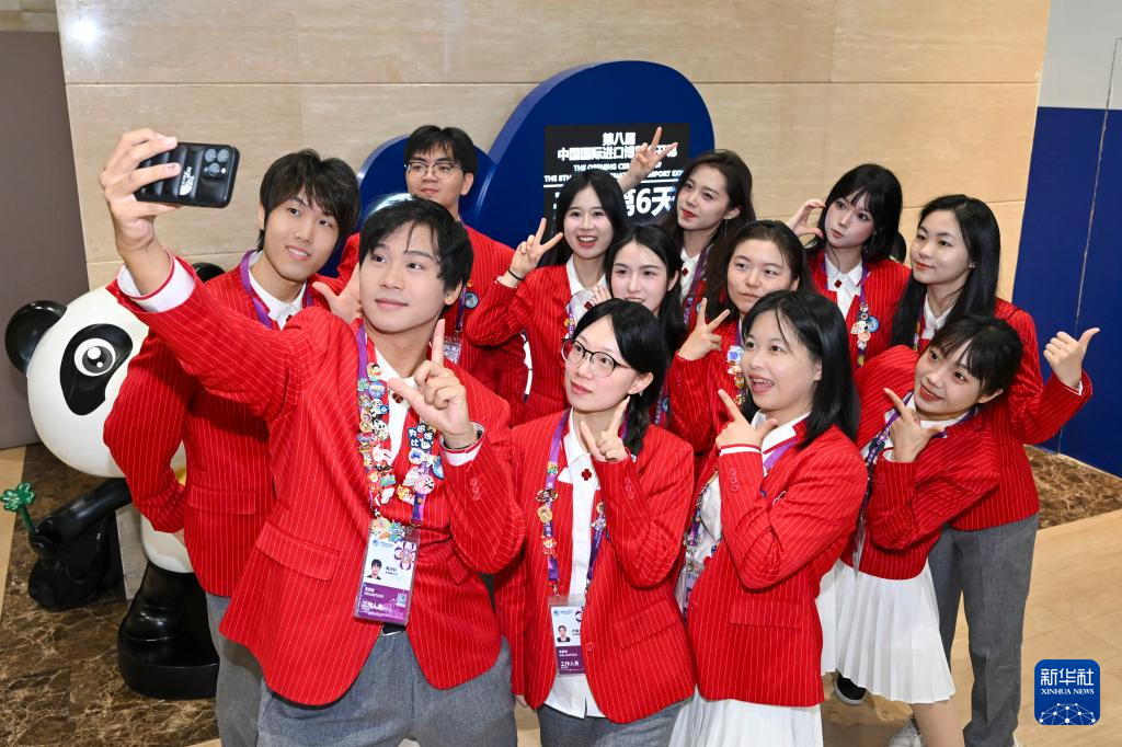 11月10日,志愿者在第八屆進博會新聞中心合影。