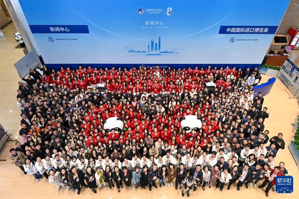 11月10日,志愿者和工作人員在第八屆進博會新聞中心合影。