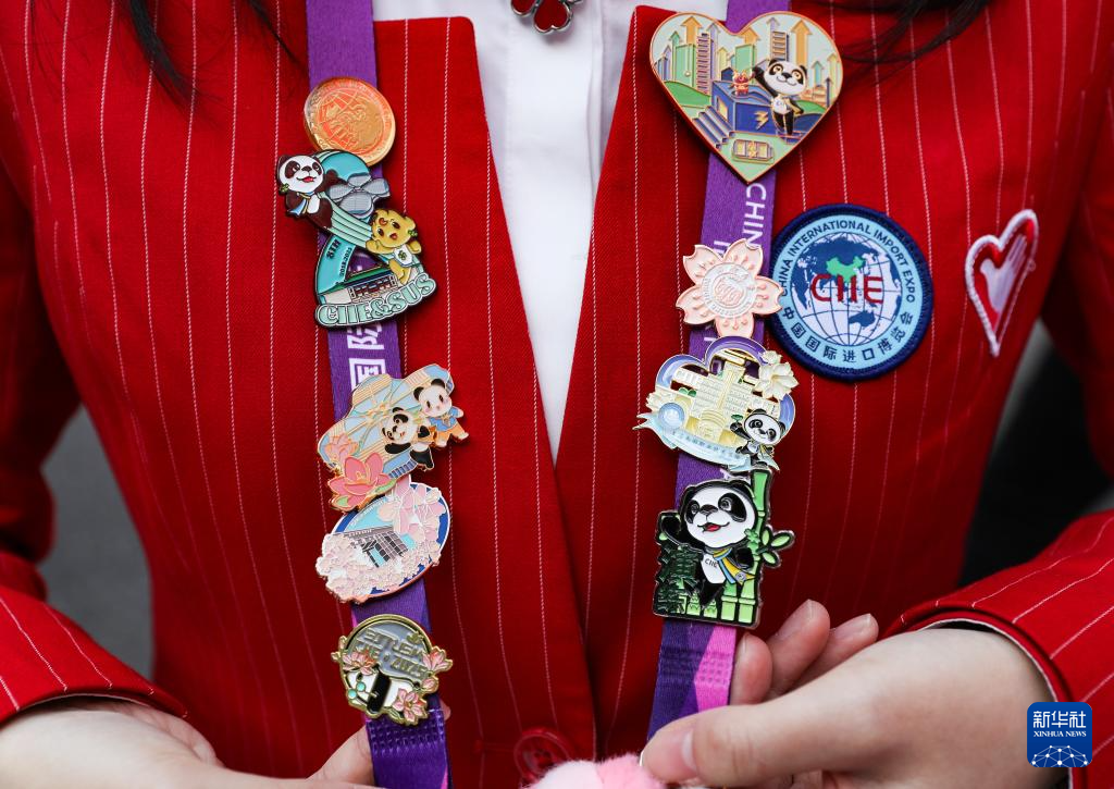 11月10日,一名志愿者展示自己在進博會上收集到的徽章。