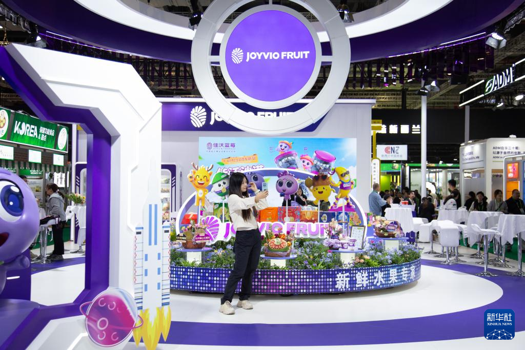 11月10日,在農食產品展區的一個展臺,一名參觀者自拍留念。