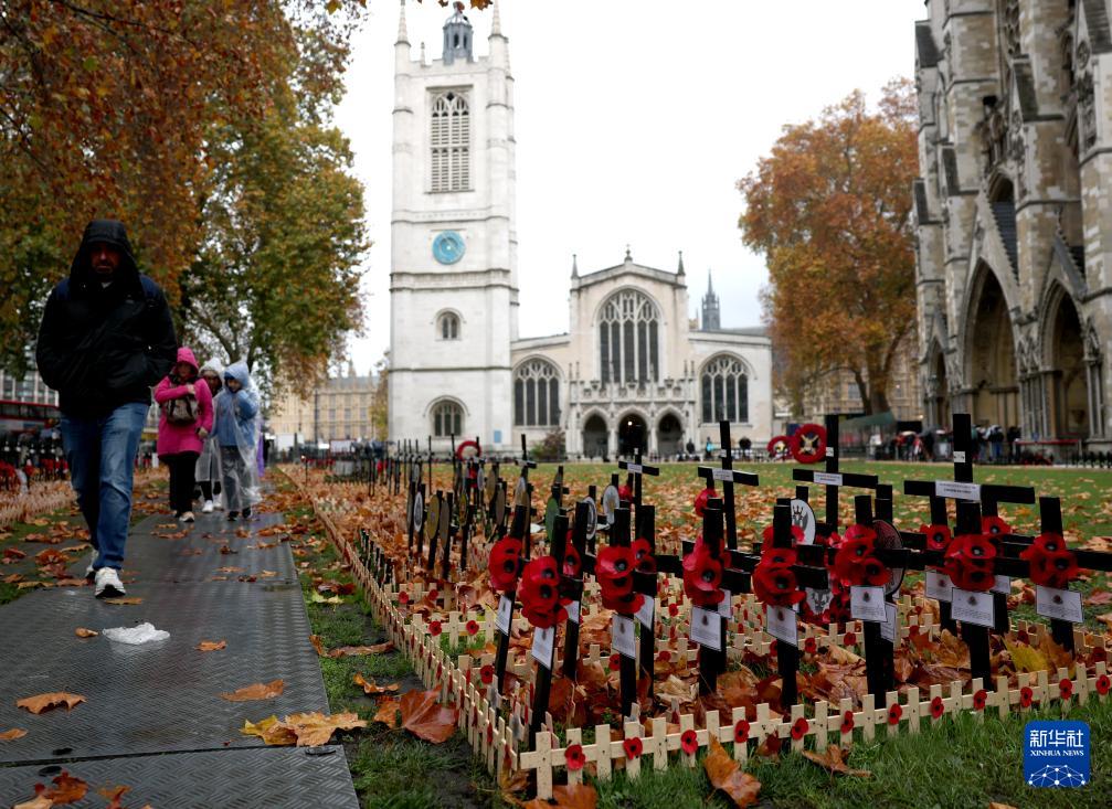 11月10日,在英國倫敦威斯敏斯特教堂外,人們走過悼念標識。
