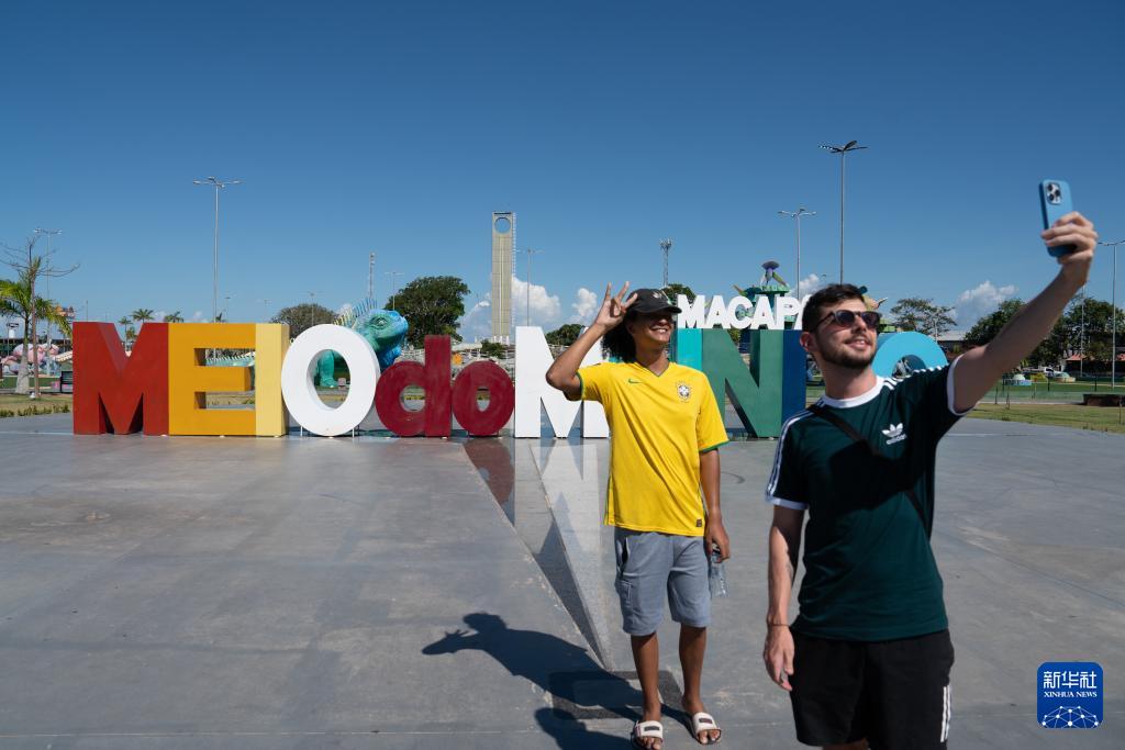 11月8日,游客在巴西馬卡帕市赤道線紀念廣場附近合影留念。
