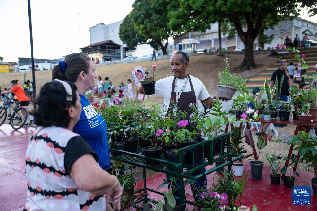 11月8日,在巴西馬卡帕市一處公園,花商向顧客展示盆栽花卉。