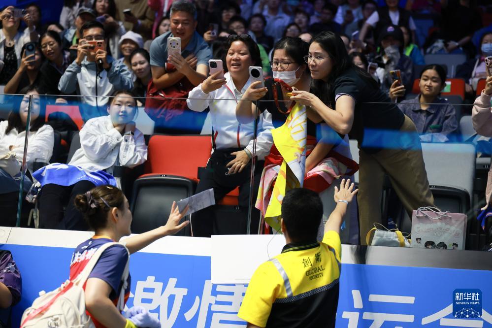 11月11日,陳夢(前左)在比賽結束后與觀眾互動。