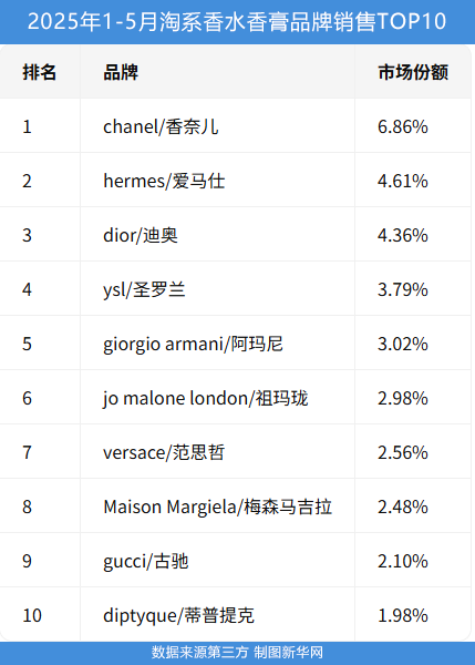 這一態勢在香水品類的重要銷售渠道淘系平臺(淘寶+天貓)的數據中也有所體現。國際大牌牢牢占據淘系平臺香水品牌銷售前十。數據顯示,2025年1-5月,榜單前十仍由香奈兒、圣羅蘭、祖瑪瓏等國際大牌壟斷。