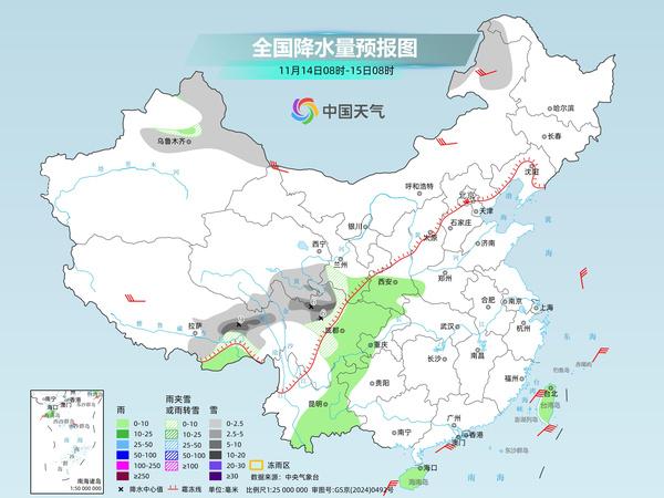 明天,新疆北部、內蒙古東北部、西藏南部和東部、西北地區中部、甘肅南部、西南地區北部、四川盆地西南部等地部分地區有小雪或雨夾雪,其中,西藏東部、川西高原北部等地部分地區有中到大雪。西藏南部、甘肅南部、陜西中南部、河南西部、四川盆地中東部和西部、重慶西部、貴州西北部、云南中東部和西南部、海南島、臺灣島等地部分地區有小雨。