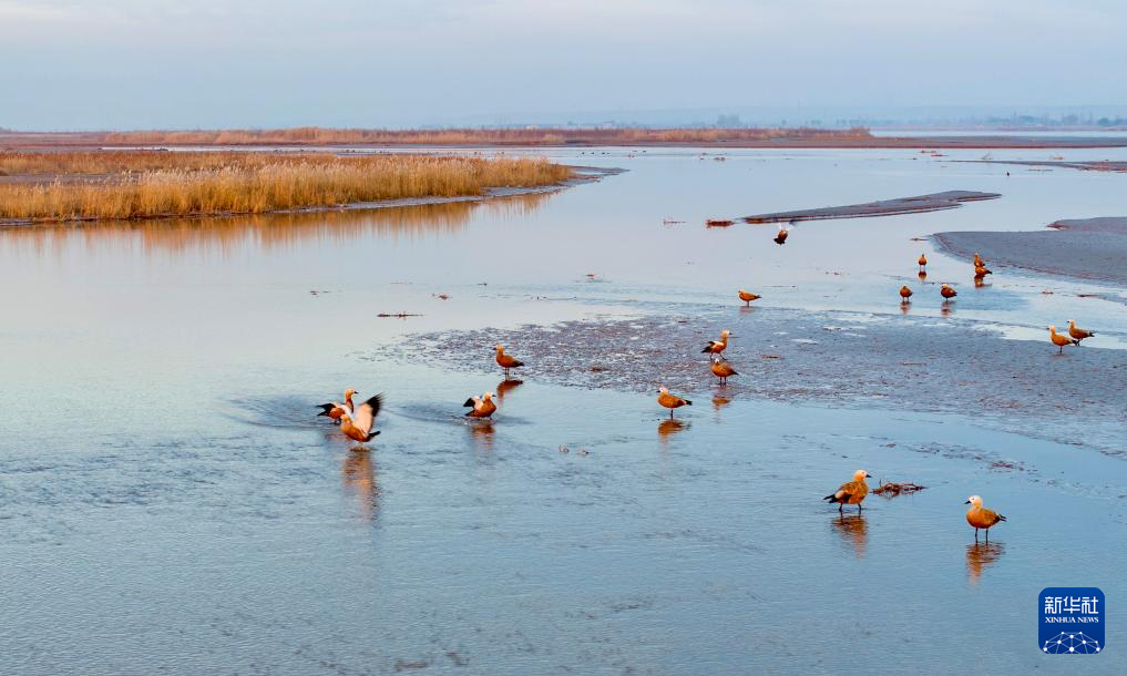 11月11日,候鳥在寧夏平羅天河灣國家濕地公園棲息覓食(無人機照片)。