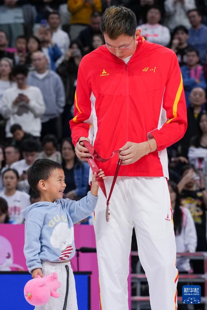 11月12日,四川隊球員周琦把銅牌拿給自己的孩子看。