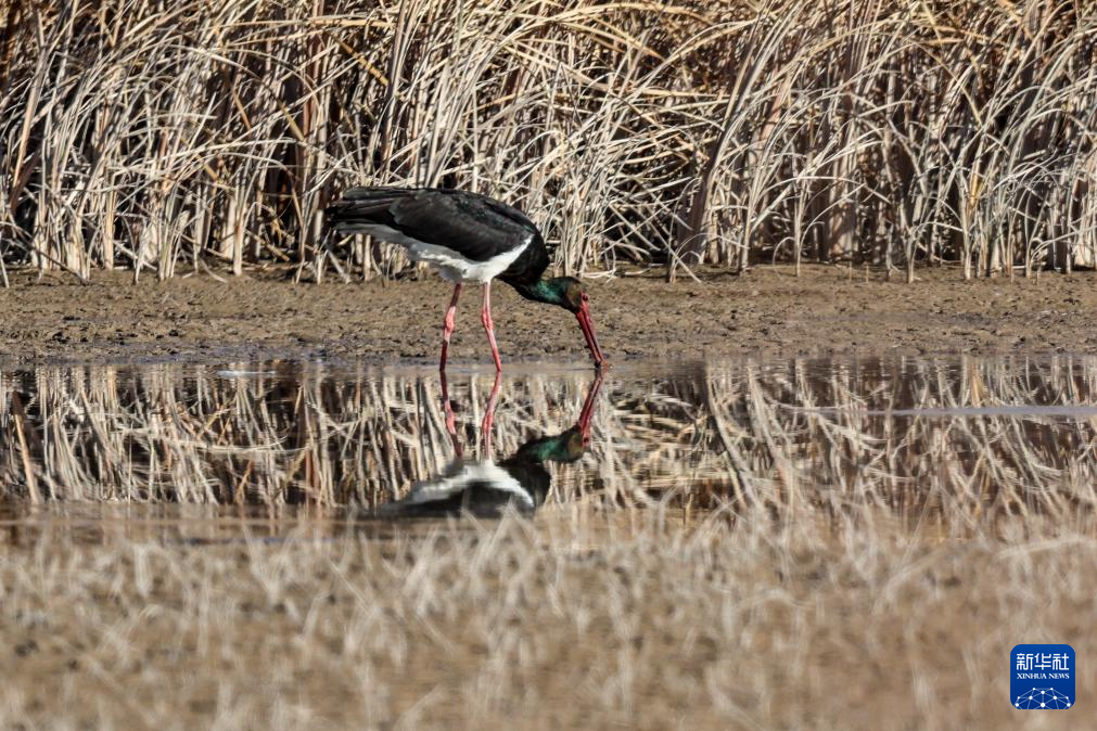 11月12日,黑鸛在張掖黑河濕地國家級自然保護區(qū)高臺段一處濕地淺灘覓食。