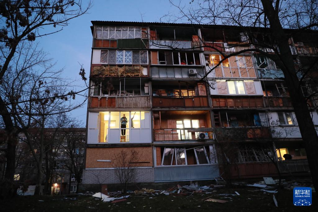 11月14日,在烏克蘭首都基輔市第聶伯區(qū),當(dāng)?shù)鼐用駥υ馐芸找u損毀的房屋進(jìn)行修繕加固。