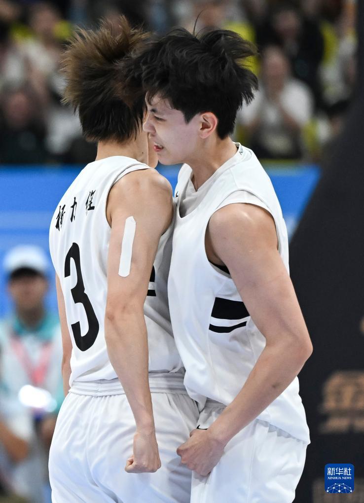 11月15日,廣東隊球員楊舒予(右)在投進三分球后與隊友楊力維慶祝。