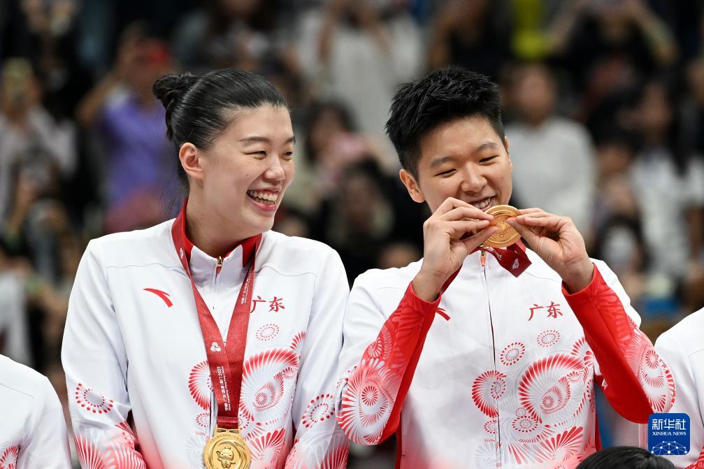 11月15日,廣東隊球員黃思靜(右)在頒獎儀式上查看金牌。