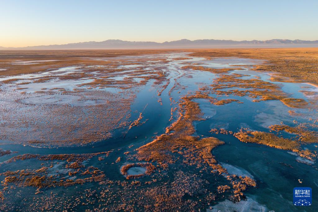 這是11月14日在甘肅省酒泉市阿克塞縣阿伊納鄉拍攝的小蘇干湖風光(無人機照片)。