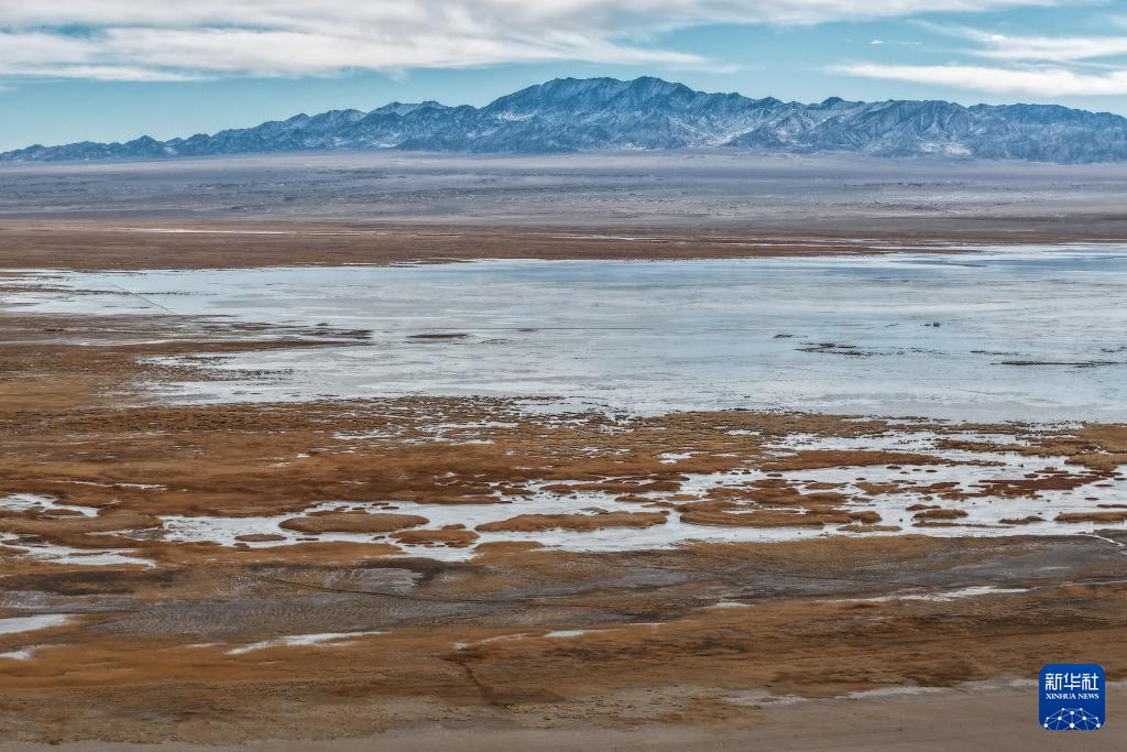 這是11月16日在甘肅省酒泉市阿克塞縣阿伊納鄉拍攝的大蘇干湖結冰湖面(無人機照片)。