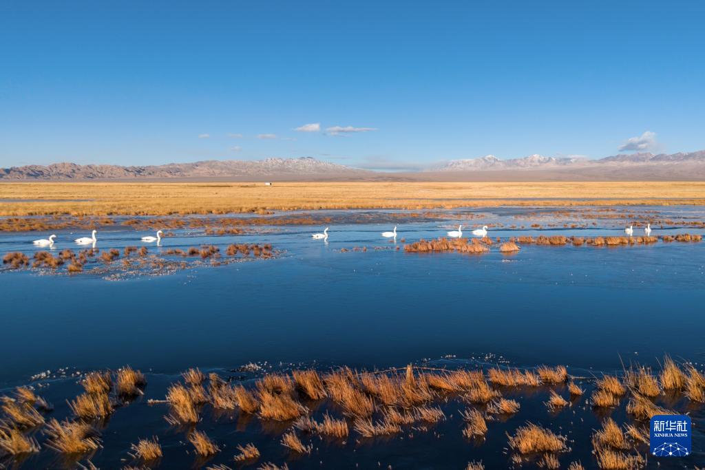 11月14日,大天鵝在甘肅省阿克塞縣小蘇干湖省級(jí)候鳥自然保護(hù)區(qū)游弋覓食(無人機(jī)照片)。