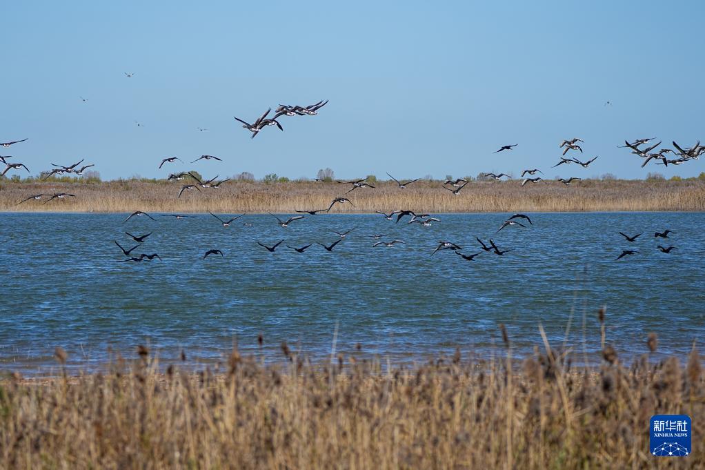 11月13日,山東黃河三角洲國家級自然保護區(qū)內(nèi),越冬候鳥在飛翔。