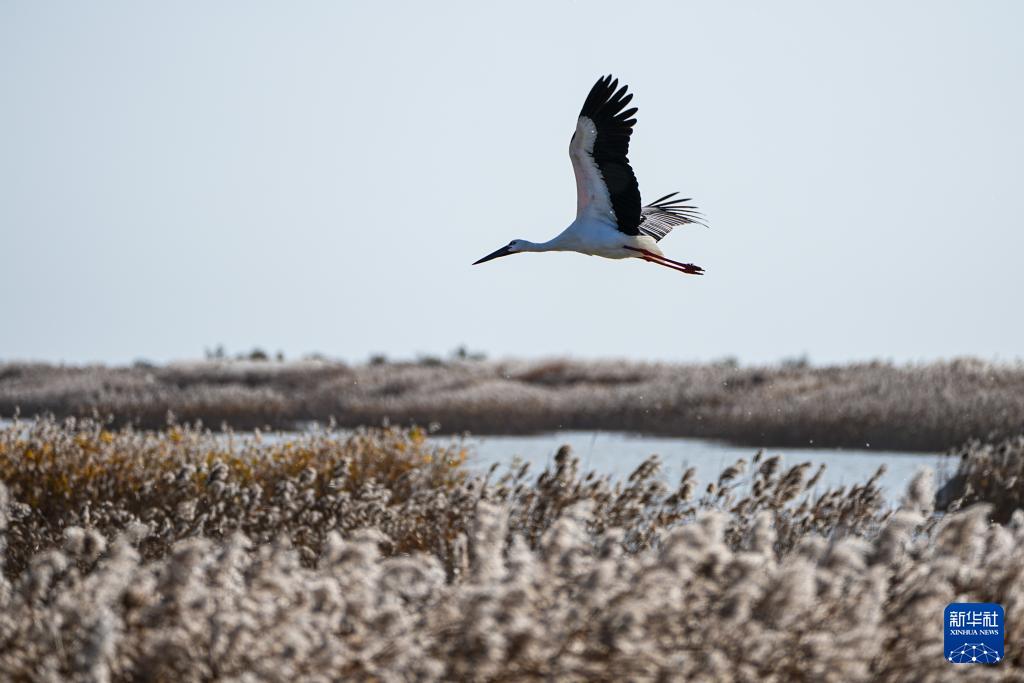 11月13日,山東黃河三角洲國家級自然保護區(qū)內(nèi),越冬的白鸛在飛翔。