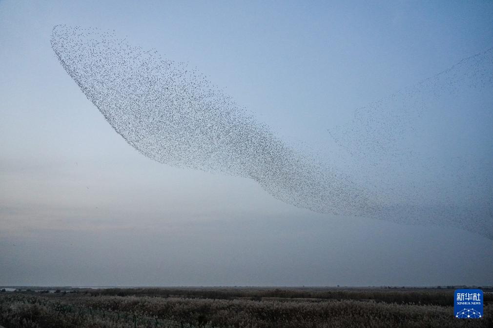 11月12日,山東黃河三角洲國家級自然保護區(qū)內(nèi),飛翔的越冬候鳥形成"鳥浪"景象。