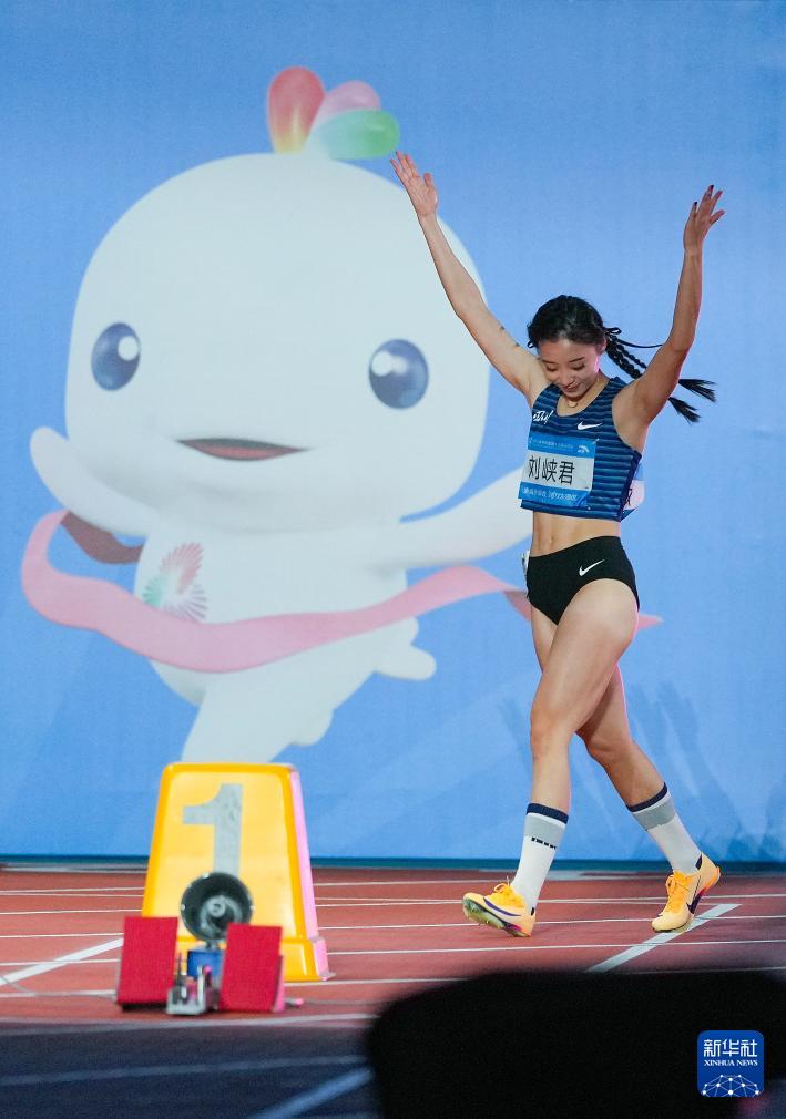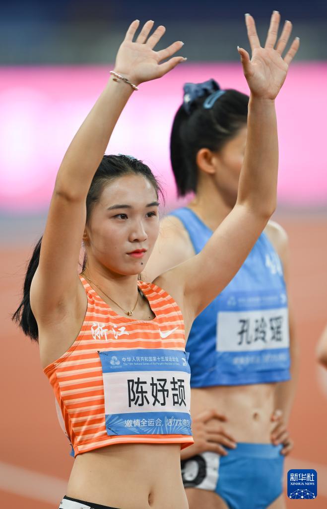 11月17日,浙江隊選手陳妤頡在比賽前向觀眾致意。最終她以11秒10的成績奪得冠軍。