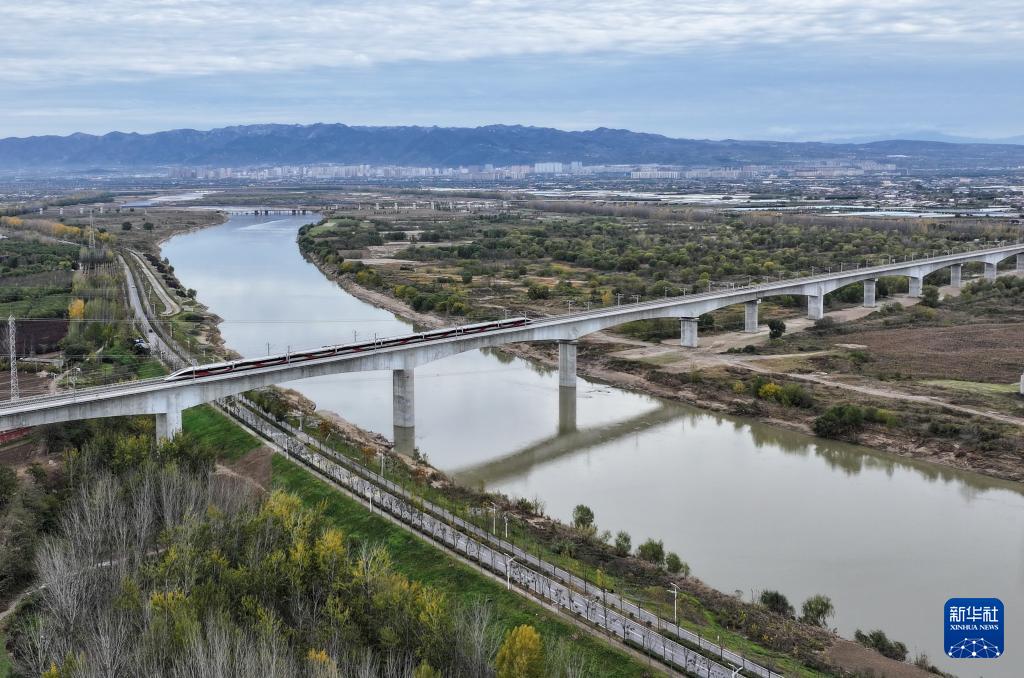 11月17日,一列試驗動車組通過西延高鐵渭河特大橋(無人機照片)。