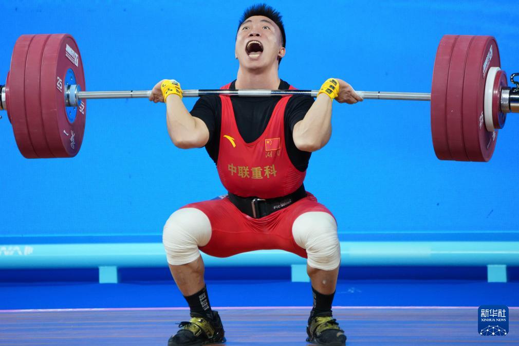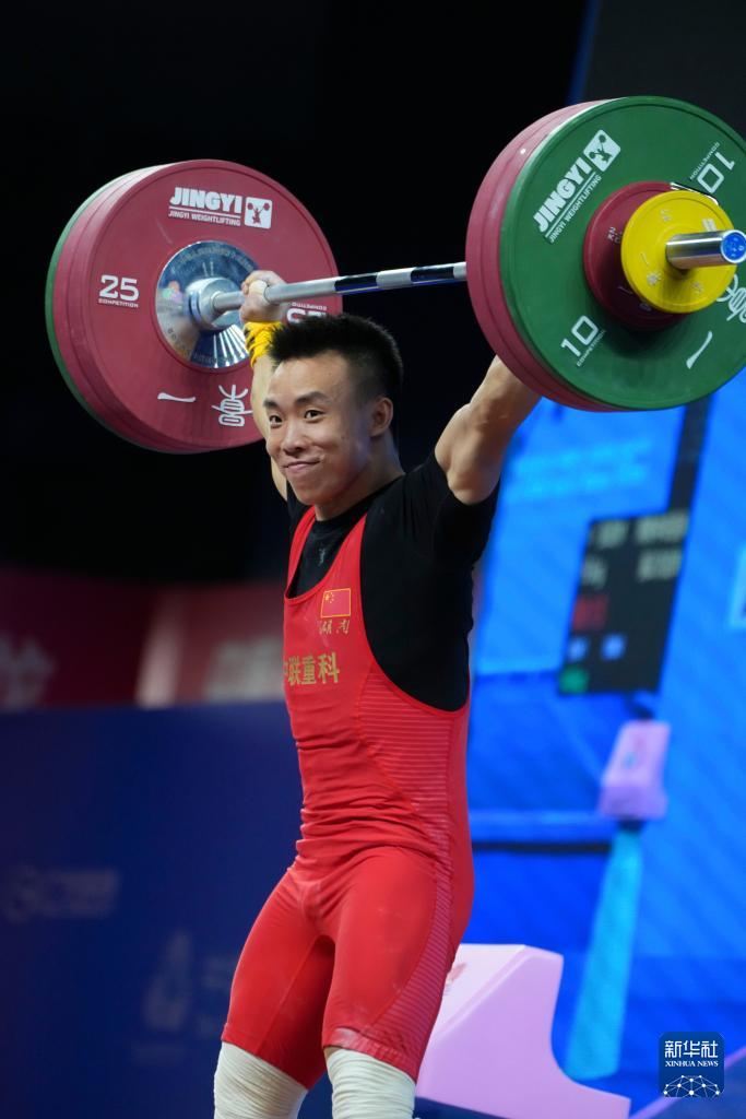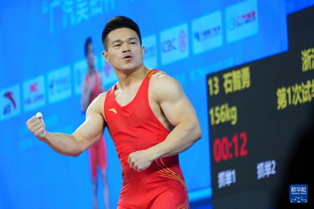 11月17日,浙江隊選手石智勇在抓舉比賽中。他獲得冠軍。