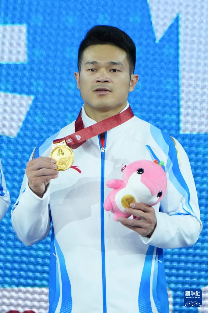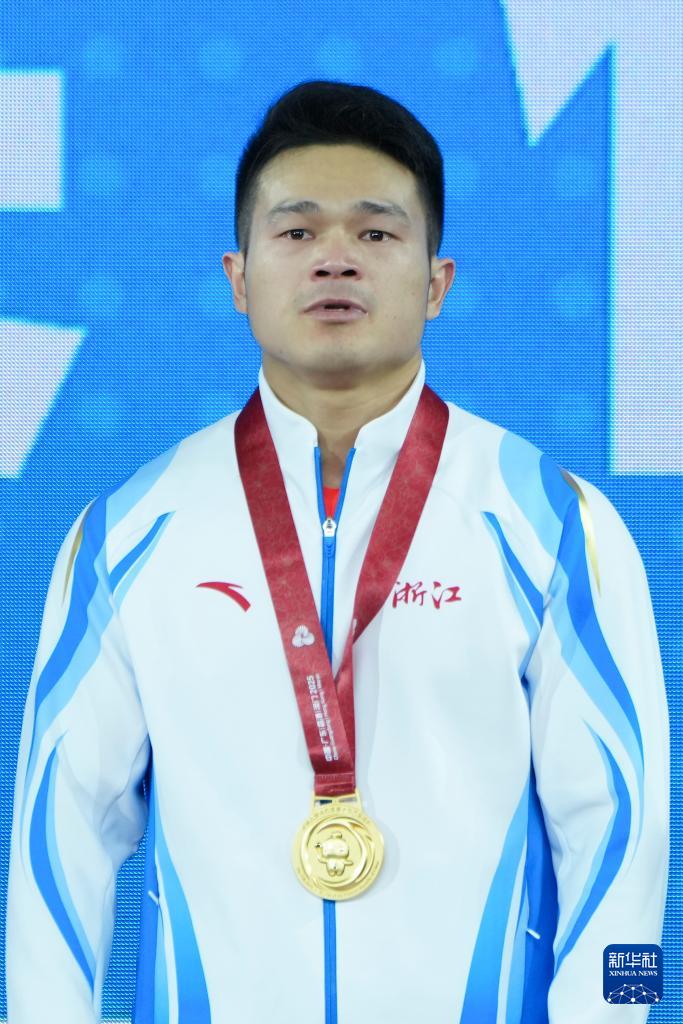 11月17日,浙江隊選手石智勇在頒獎儀式上展示金牌。