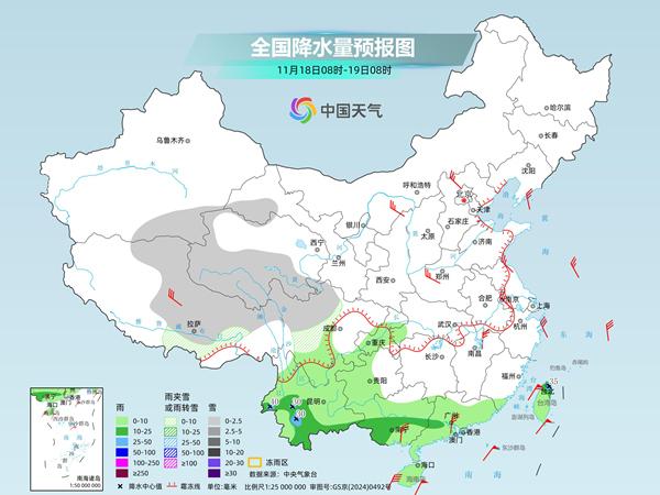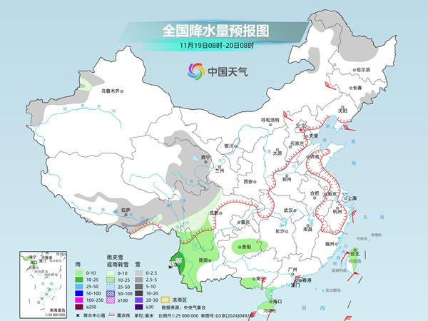 中央氣象臺預計,今天,新疆南疆盆地、西藏北部和東部、青海南部和西部、甘肅河西、川西高原北部等地部分地區有小雪或雨夾雪。西南地區東部和南部、華南大部、臺灣島等地部分地區有小到中雨,其中,云南西南部、臺灣島北部等地部分地區有大雨。