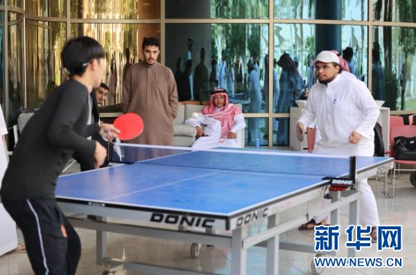 11月16日,中國和沙特學生在沙特蘇爾坦親王大學校園內舉行的中沙青年文化交流活動上打乒乓球。記者 羅晨 攝
