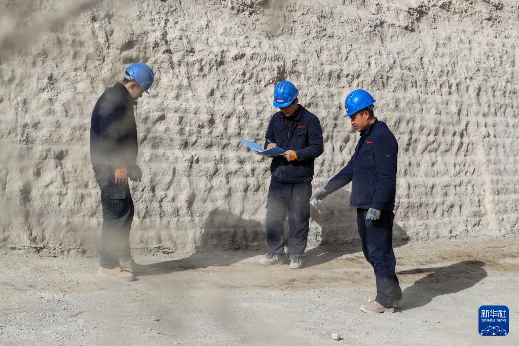 11月18日,敦煌研究院文物保護技術服務中心工作人員在觀察西墻墻基排水處理效果。