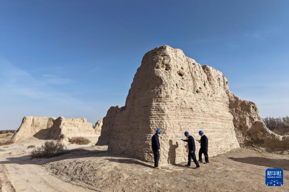 11月18日,敦煌研究院文物保護技術服務中心工作人員觀察西墻馬面的夯筑支頂加固效果(無人機照片)。