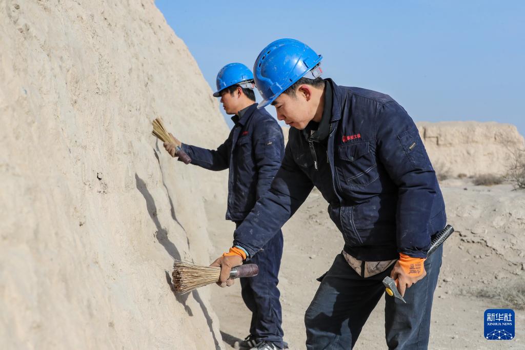 11月18日,敦煌研究院文物保護(hù)技術(shù)服務(wù)中心工作人員利用刷子對(duì)夯筑面進(jìn)行修整,使其更好地與遺址墻體保持一致。