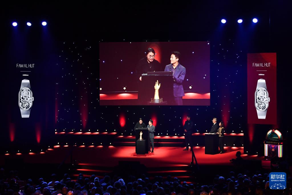 11月13日,在瑞士日內(nèi)瓦,中國(guó)制表品牌“北落師門(mén)”創(chuàng)始人代欣言(中左)在頒獎(jiǎng)典禮上發(fā)言。