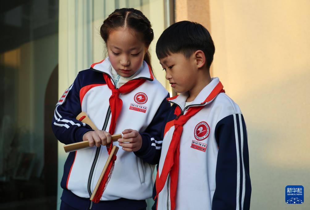 在遼寧盤錦,金書瑤(左)教同學(xué)打快板(11月18日攝)。