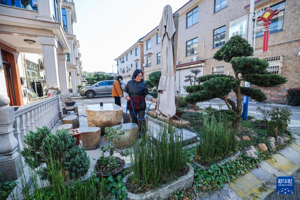 11月19日,呂山鄉(xiāng)龍溪村的村民在給自家庭院的綠植澆水。