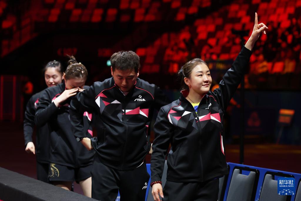 11月19日,河北隊選手何卓佳(前右)在女單比賽中與團隊溝通。