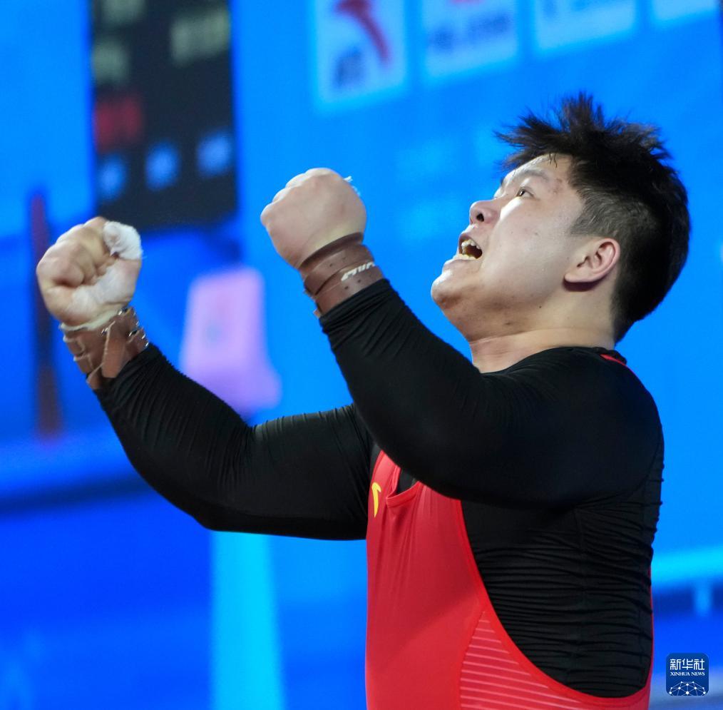 11月19日,遼寧隊選手鄒元清在挺舉比賽中試舉成功后慶祝。最終,他獲得季軍。