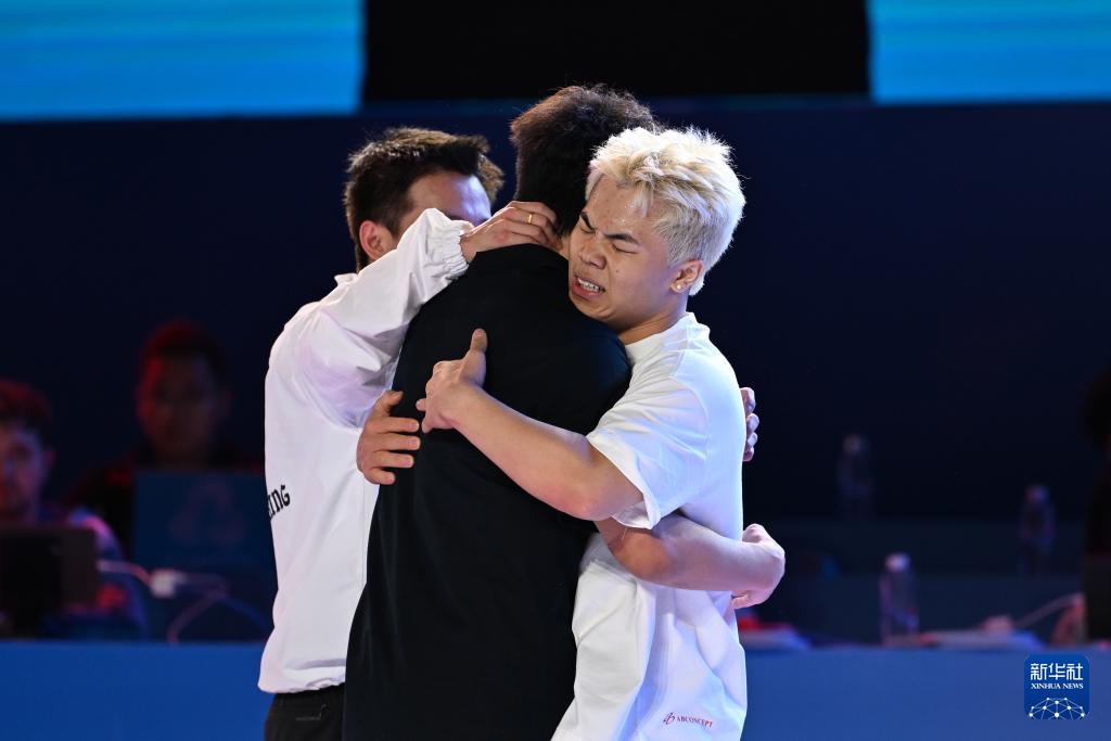 11月19日,湖北隊選手王瑞苗(右)獲勝后擁抱江蘇隊選手亓祥宇(中)。