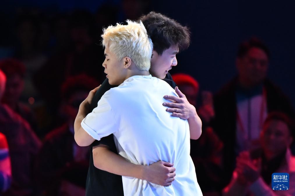 11月19日,湖北隊(duì)選手王瑞苗(前)獲勝后擁抱江蘇隊(duì)選手亓祥宇。