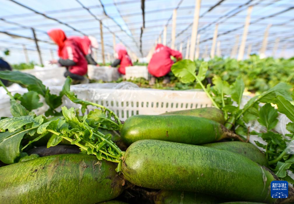 11月20日,在天津市西青區(qū)辛口鎮(zhèn)種植沙窩蘿卜的大棚內(nèi),農(nóng)民在采摘蘿卜。