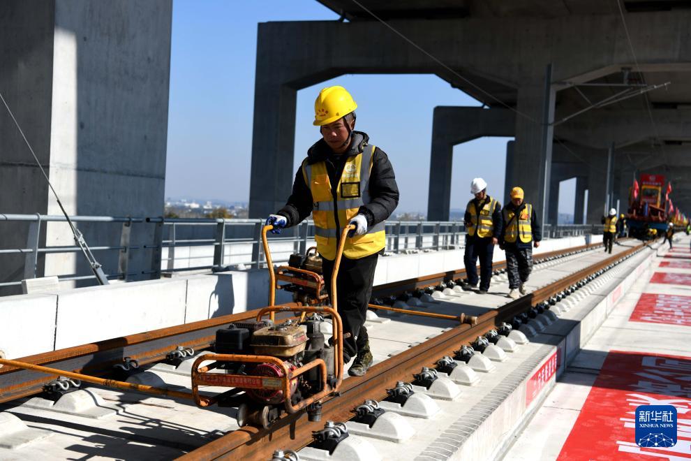 11月20日,中鐵四局施工人員在巢馬城際鐵路鋪軌施工現(xiàn)場作業(yè)。