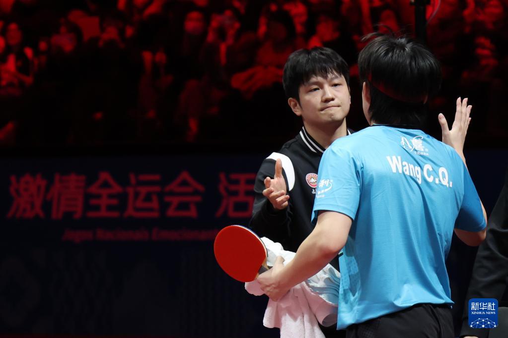 11月20日,北京隊選手王楚欽(右)和上海隊選手樊振東在比賽后相互致意。