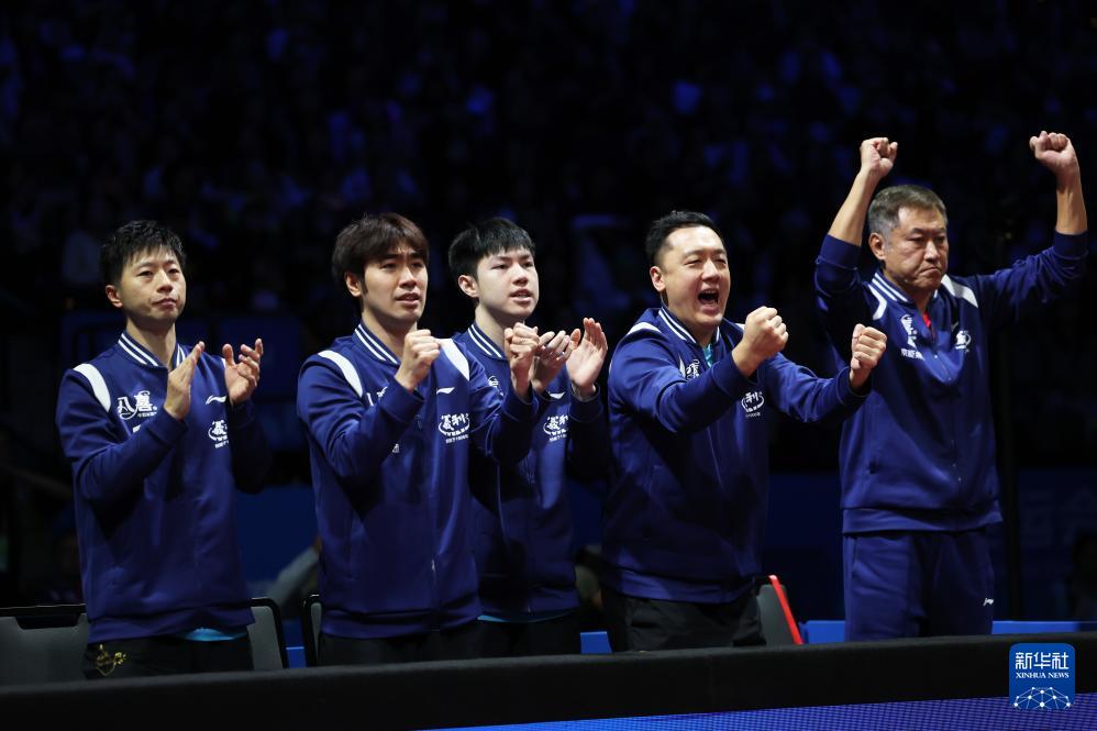 11月20日,北京隊成員在場邊為隊友王楚欽加油助威。