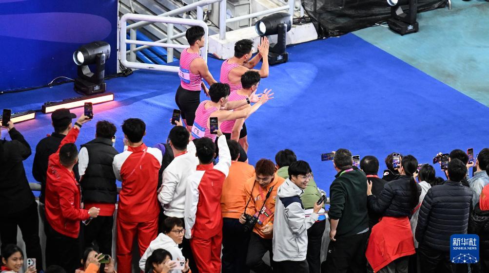 11月20日,廣東隊選手劉洪熙、蘇炳添、施君豪、陳冠鋒(從左至右)在比賽后。