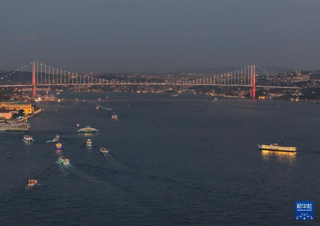夜幕降臨,博斯普魯斯海峽上船只穿梭,兩岸燈火璀璨。