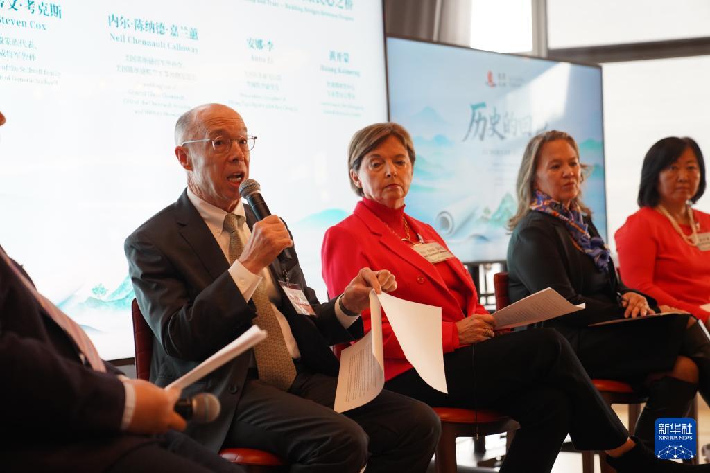 11月25日,在美國(guó)紐約舉行的2025鼓嶺論壇上,史迪威家族代表、史迪威將軍外孫特里·史蒂文·考克斯(左一)分享先人與中國(guó)人民共同抗戰(zhàn)的歷史。新華社記者張鳳國(guó)攝