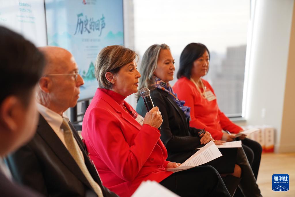 11月25日,在美國(guó)紐約舉行的2025鼓嶺論壇上,陳納德將軍外孫女、美國(guó)陳納德航空軍事博物館館長(zhǎng)內(nèi)爾·陳納德·卡洛韋(右三)分享先人與中國(guó)人民共同抗戰(zhàn)的歷史。新華社記者張鳳國(guó)攝