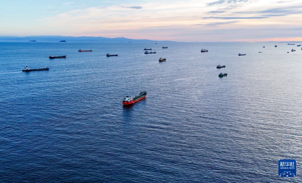 這是11月25日拍攝的停泊在土耳其伊斯坦布爾馬爾馬拉海上的船只(無人機照片)。