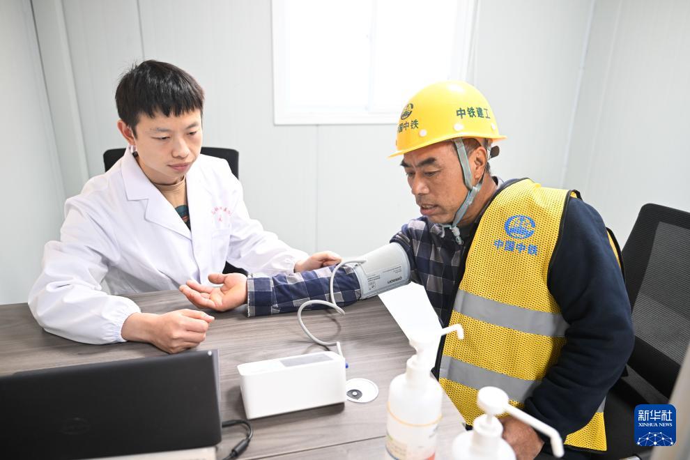 11月25日,醫生在蘇州北站新時代建筑工人社區衛生服務站為工人測量血壓。