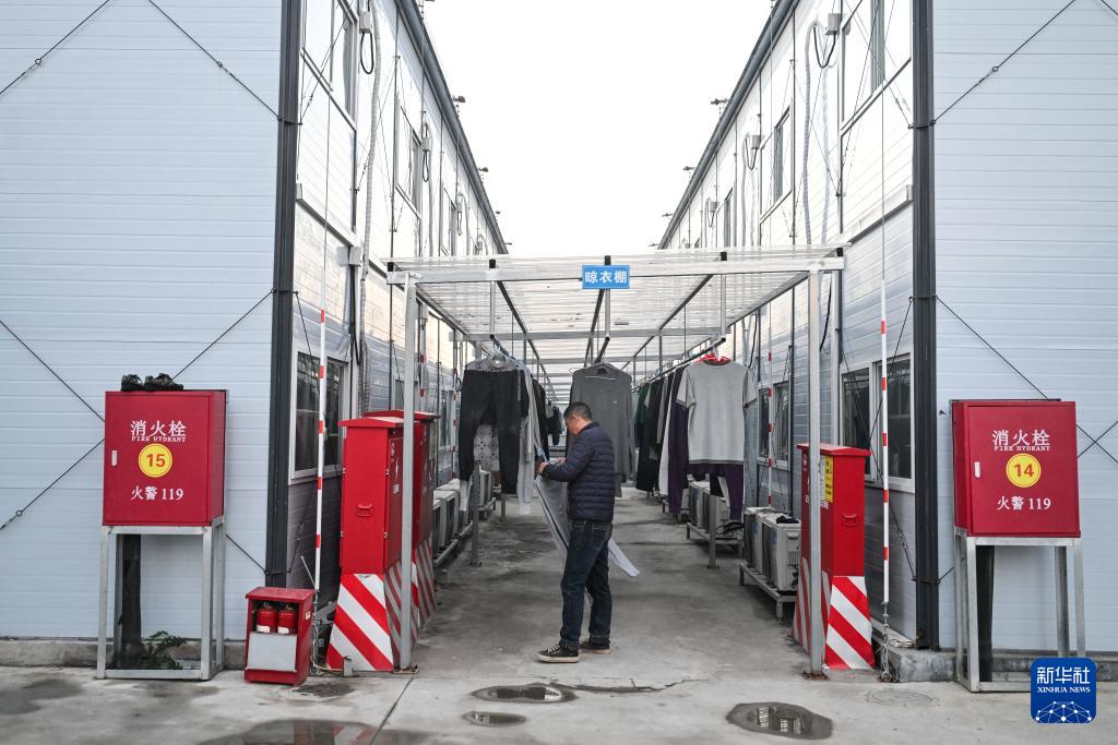 11月25日,工人在蘇州北站新時代建筑工人社區住宿區收衣服。
