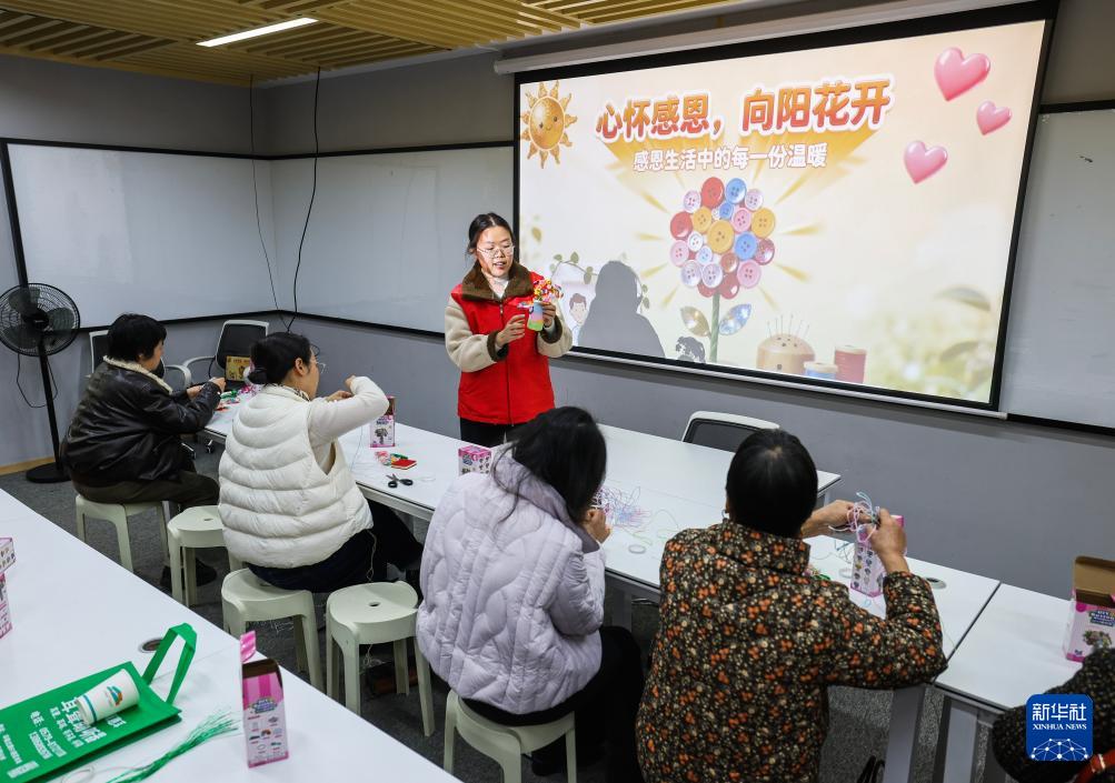 11月27日,在孝順鎮府東社區的黨群服務中心,志愿者教居民制作手工藝擺件。